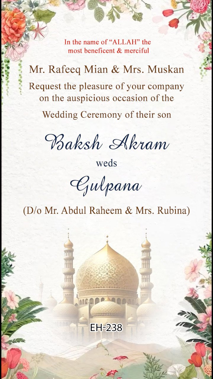 Code EH-421rs 1500/- Code EH-352rs 1200/- Code EH-243rs 2500/- Code EH-241rs 2500/- Code EH-238rs 800/- Code EH-210rs 800/- How to order ? > Just select a invitation from our gallery and tap to order on whatsapp, share your detail (like text and photos) on whatsapp. you will get instant reply from our team.